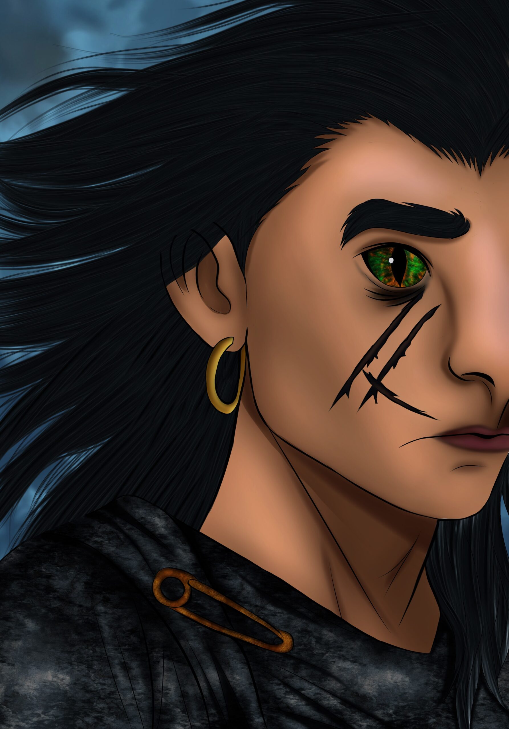 Non-human character study. Green cat eyes, black hair, medium skin tone, a gold earring and scars on one cheek.