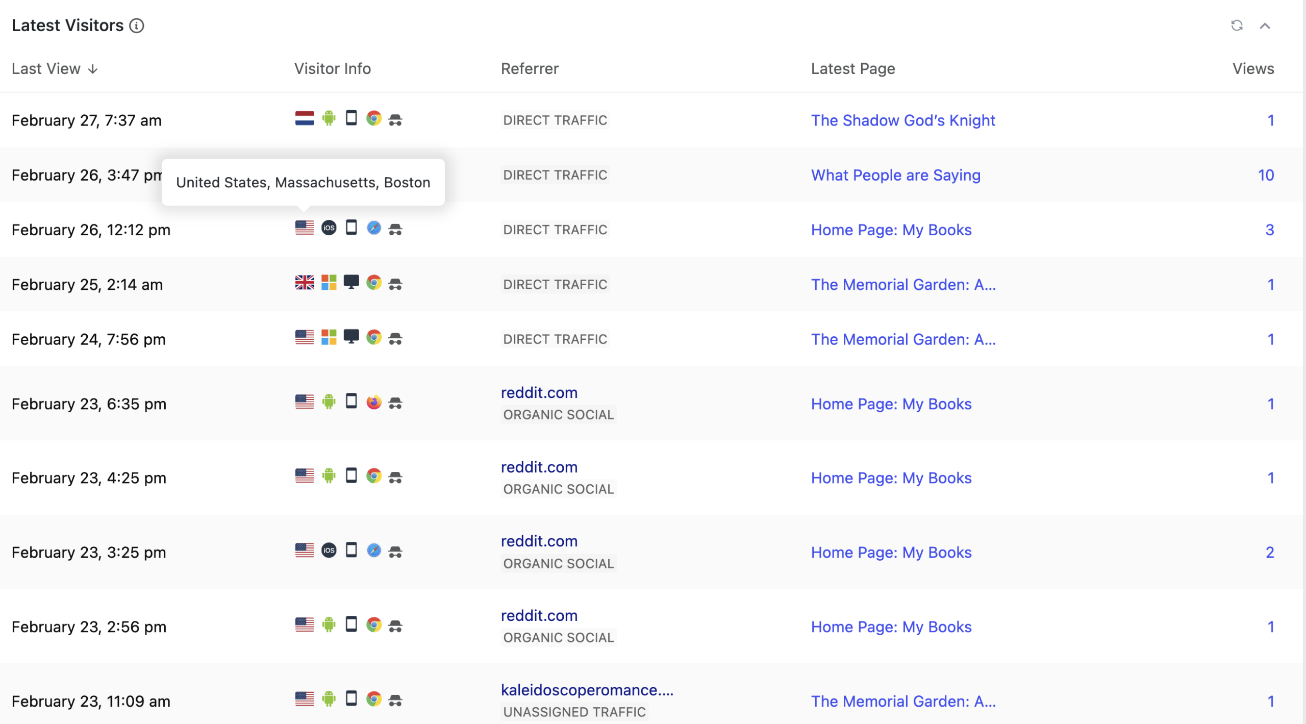 At the bottom, you can see a hit referred by kaleidoscoperomance.com. That’s a cross-promotion with another author who puts together newsletters of related fiction. Check them out!